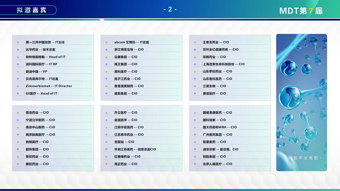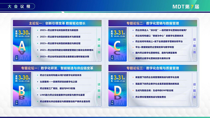 在新的市場契機下,由勤哲文化主辦的MDT 2023第七屆中國醫藥健康數字科技大會應勢而來。本次大會以“2023:加速構建數據驅動的智慧企業”為主題,將于2023年3月30-31日在上海隆重舉行,現場匯集350+醫藥健康行業知名企業高管、CIO、 IT負責人以及行業優秀信息化服務商。從業界最佳實踐、技術發展趨勢、轉型價值發現、頭部企業案例出發,多方面探討制醫藥健康企業該如何通過數字化轉型充分賦能自身成長;如何結合自身優勢,進行數字化戰略布局。