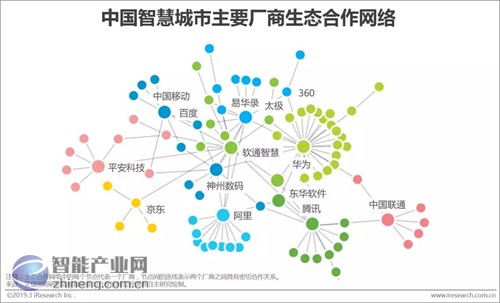 總體來看,智慧城市行業(yè)已經(jīng)形成以行業(yè)巨頭(如華為、阿里、騰訊、平安、移動(dòng)、聯(lián)通)、第三方專業(yè)服務(wù)(如軟通、易華錄)、技術(shù)提供方(如京東、百度)為核心的產(chǎn)業(yè)生態(tài)格局。廠商之間相互聯(lián)系合作,共同構(gòu)成了多元的生態(tài)合作網(wǎng)絡(luò)。