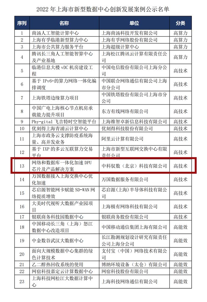 中科馭數入選上海市新型數據中心創新發展案例