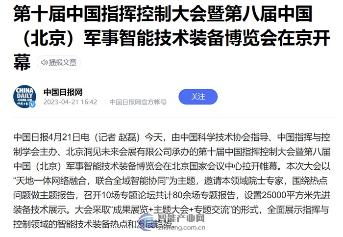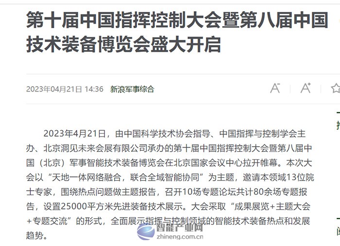 2023年4月23日,由中國指揮與控制學會主辦的第十屆中國指揮控制大會暨第八屆中國(北京)軍事智能技術裝備博覽會在北京國家會議中心完美收官!中國指揮控制大會盛況空前,專題論壇場場爆滿,軍博會吸引了央視CCTV-13、CCTV-4中文國際頻道、北京衛視、中國網、光明網、中華網、新浪網、鳳凰網、中國日報、環球時報、環球網等新聞媒體的爭相報道。