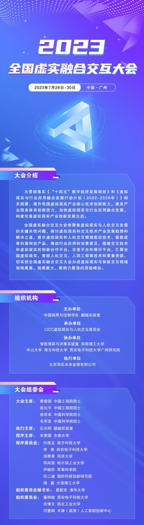 在貫徹實施《十四五”數字經濟發展規劃》和《虛擬現實與行業應用融合發展行動計劃(2022-2026 年)》的背景下,為提升我國虛擬現實產業核心技術創新能力,加快虛擬現實與行業應用的融合發展,構建完善虛擬現實產業創新發展生態,由四位知名院士共同擔任大會主席的全國虛實融合交互大會將于 7 月 28 日-30 日在廣州舉行。