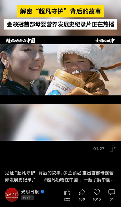光明日報客戶端報道金領冠紀錄片《超凡奶粉在中國》