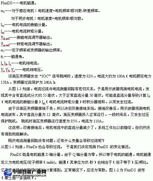 從圖1-4知道,F(xiàn)luxDs幾乎為常數(shù)。用示波器觀測(cè)電機(jī)電壓波形沒有發(fā)現(xiàn)畸變。為了進(jìn)一步驗(yàn)證,我們換上舊的浪涌吸收器,變頻器運(yùn)行一會(huì)后又出現(xiàn)過流。目前變頻器工作穩(wěn)定可靠。
