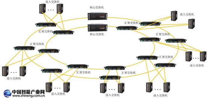 匯聚層本系統(tǒng)中千兆雙環(huán)形匯聚網(wǎng),千兆環(huán)狀網(wǎng)絡(luò)采用MR-ring自愈環(huán)網(wǎng)冗余協(xié)議,將接入層數(shù)據(jù)進(jìn)行環(huán)狀匯聚,保證了網(wǎng)絡(luò)的穩(wěn)定和可靠。