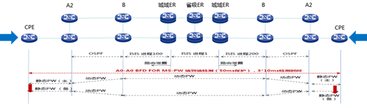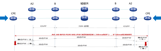 大客戶專線業務以B 設備為界,接入環與核心層采用不同的IGP路由進程。B以上骨干采用ISIS,B以下接入環采用OSPF。二層業務端到端配置5段pw分別為:CPE到A2采用靜態pw,A2到B采用動態pw,B到對端B采用動態pw,B到A2采用動態pw,A2到CPE采用靜態pw,A2和B屬于跨pw節點需要實現pw粘貼。全網端到端兩條主備pw,并且配置CPE到對端CPE的端到端bfd for 多段pw,一旦主pw上發生設備、鏈路等故障,端到端pw全部切換到備份pw上,保障50ms內快速檢測并故障切換。