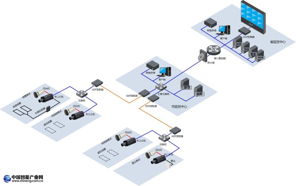 卡口監(jiān)控工程可分為三大部分:前端卡口部分、網(wǎng)絡(luò)傳輸部分和監(jiān)控中心平臺(tái)部分。其中卡口部分分布在各安裝卡點(diǎn)上,通過(guò)傳輸網(wǎng)絡(luò)與監(jiān)控中心連接,進(jìn)行數(shù)據(jù)傳輸和實(shí)時(shí)指令通訊。采用網(wǎng)絡(luò)技術(shù),將卡口部分與監(jiān)控中心形成一個(gè)整體,提高車(chē)輛監(jiān)控的工作效率以及數(shù)據(jù)的安全性,可靠性。