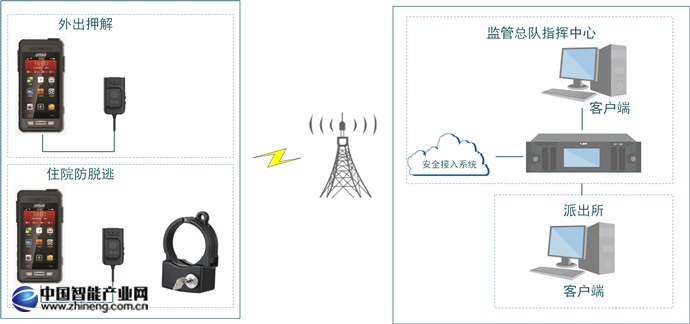 本系統是針對在押人員所外就醫安全防控而專門設計的一套系統,包括便攜手持終端、外置攝像頭、三角支架和在押人員電子腳鐐;對在押人員在押送途中和住院治療的過程進行全程監控,并在出現突發事件時利用手持終端進行作戰指揮。
