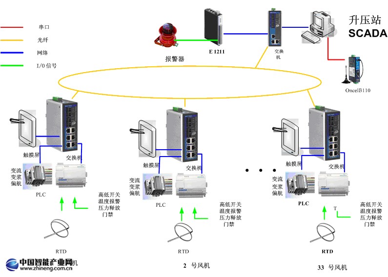 在這個案例中,一個風場共有33臺1.5MW的風機,每臺風機搭配一臺箱變,因此在每臺箱變中選用一臺ioLogik E2242(或E1261),來采集箱變中的油溫、壓力、報警開關、瓦斯保護等參數數據。ioLogik E2242(或E1261)向上連接現場交換機,所有的交換機組成光纖環網,以確保數據可以實時的上傳至SCADA系統。基于這種架構,客戶只需極少的投入就實現了風機箱變的在線監測功能,一旦發生問題,系統會自動報警,大大減少了人員的出差和后期設備維護成本。