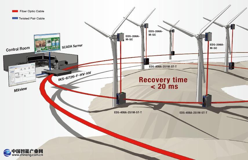 由于需要極高的安全性和可用性,DSTW在風(fēng)場(chǎng)部署了一個(gè)環(huán)形拓?fù)渚W(wǎng)絡(luò)結(jié)構(gòu),在網(wǎng)絡(luò)連接失敗時(shí)能夠提供快速冗余。控制中心采用了IKS-6726 機(jī)架式網(wǎng)管型工業(yè)以太網(wǎng)交換機(jī)來連接現(xiàn)場(chǎng)SCADA系統(tǒng)中的交換機(jī)和網(wǎng)管服務(wù)器。Moxa MXview 網(wǎng)絡(luò)管理軟件會(huì)自動(dòng)發(fā)現(xiàn)網(wǎng)絡(luò)拓?fù)洌@示實(shí)時(shí)報(bào)警信息,幫助管理員操輕松監(jiān)視網(wǎng)絡(luò)狀態(tài)。