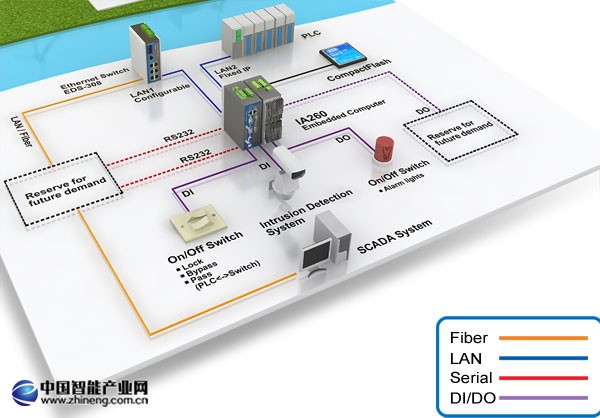 Moxa IA260有8+8 路DI/DO控制on/off開關(guān)系統(tǒng)、入侵檢測及報警燈光系統(tǒng)。另外,某些DI/DO可保留以備后續(xù)使用。雙LAN端口(一個固定IP,一個可配置端口)允許數(shù)據(jù)從PLC向以太網(wǎng)交換機傳輸數(shù)據(jù),然后交換機將數(shù)據(jù)傳送至SCADA系統(tǒng)。另外,一個緊湊閃存插槽和額外串行接口(4個串行端口)可用于以后的存儲擴展及使用。