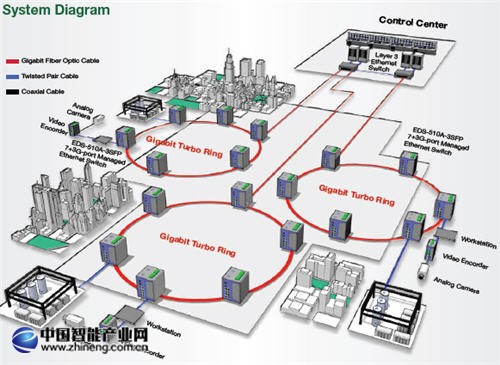 膠州電能集團(tuán)擁有位于3個(gè)不同城市的30個(gè)變電站。 為了更可靠地進(jìn)行配電監(jiān)控,膠州電能集團(tuán)為他們的能量控制系統(tǒng)部署了一個(gè)以太網(wǎng)環(huán)形拓?fù)浣Y(jié)構(gòu)。 基于這30個(gè)變電站所處的位置,使用 Moxa 公司的 EDS-510A-3SFP Gigabit 網(wǎng)管型以太網(wǎng)交換機(jī)建造了3個(gè)環(huán)形以太網(wǎng)。 這些環(huán)形以太網(wǎng)使用 Moxa 公司的 Turbo Ring 專利技術(shù)作為備用系統(tǒng)。 配電系統(tǒng)的保護(hù)繼電器直接連接到 EDS-510A-3SFP 交換機(jī)上,共同組成一個(gè)受 Moxa 公司 Turbo Ring 協(xié)議保護(hù)的環(huán)形拓?fù)洌瑥亩WC在網(wǎng)絡(luò)故障時(shí)實(shí)現(xiàn)毫秒級(jí)的恢復(fù)。 此外,每一個(gè) EDS-510A-3SFP 交換機(jī)都連到一個(gè)用于視頻監(jiān)控的工作站,從而為系統(tǒng)維護(hù)人員在現(xiàn)場(chǎng)進(jìn)行監(jiān)測(cè)操作提供了一個(gè)有效的途徑。 EDS-510A 交換機(jī)配備有三個(gè) Gigabit 以太網(wǎng)端口以提供高帶寬的解決方案,不僅為冗余 Gigabit Turbo Ring 骨干提供能量,也留下一個(gè)空的 Gigabit 端口用于向上連接到核心交換機(jī)上。