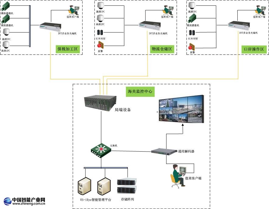 隨著信息化建設的開展,建立統一的監控信息網格,將監控業務融合在整個信息管理系統,成為目前監控需求的主要方向。海關遠程監控系統使用分布式網絡視頻接入、集中權限控制與資源管理和多級組織結構。分布式網絡視頻接入指監控前段就近將監控視頻接入到整個監控系統網絡。集中權限控制與資源管理,是指通過專門的服務器系統控制用戶訪問權限和監控前段的存儲要求,統一規劃和調配資源。多級組織結構是適應系統應用行業的分級組織結構,根據不同業務部門進行權限控制和分級管理,與原有信息管理系統相結合。
