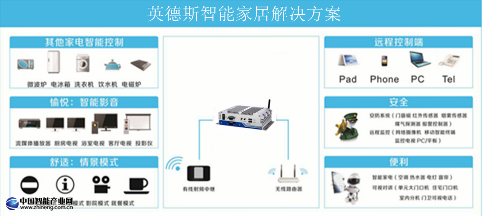 隨著計算機技術、網絡和信息技術的不斷發展,以及人們對生活要求的不斷提高,享受智能化的家居生活已經成為可能,并且成為必然的趨勢。數字式環境、網絡信息化家電、智能型住宅成為人們追求的生活空間。數字住宅的智能化需要自動化解決方案的支持,需要一部可提供多種連接接口的嵌入式無風扇工控機為平臺,連接到住宅的監視系統、門禁系統、燈光控制、音視頻控制、安防控制、室內溫度控制等子系統或其他系統。控制主機能夠采集信息,進行處理、儲存和輸出,輕松實現室內照明控制、窗簾控制、溫度控制、家電控制、門鎖監控、家庭影院、背景音樂播放等時尚科技風的現代家居,體驗高效、舒適、安全、便利、節能的生活環境。下面詳細介紹華英德斯用英特爾® 凌動™ 平臺打造的智能家居系統方案。