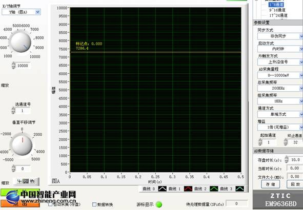 這一部分是EM9636BD數據采集卡的應用,在這一部分中,最重要的是采集參數,其中包括物理信道的選擇,采樣方式,采樣率,采樣通道數,分辨率,時鐘源等設置。數據保存是把采集來的數據保存到DAT文件里,可以通過LabVIEW編寫的程序回放,數據采集程序如圖4.2所示、數據回放界面如圖4.3所示。
