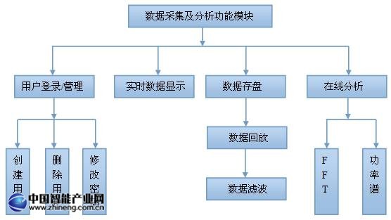 系統程序的主要功能為模塊劃分的標準,包括電機轉速控制、數據采集、在線分析、數據保存、數據回放及離線分析等功能,其中數據采集及分析功能模塊如圖4.1所示。