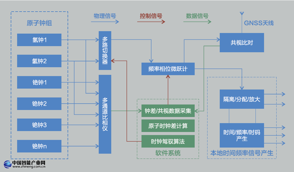 綜合原子時系統主要用于時間頻率的建標溯源,通常由以下幾部分組成:原子鐘組、多通道鐘差比對儀、遠程溯源共視比對系統、數據采集存儲、原子時計算系統、時鐘駕馭算法、高精度頻率相位微調儀、本地時間頻率生成及分配系統及恒溫恒濕環境系統組成。